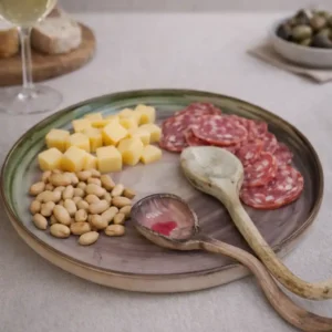 Plato para picada con dos utensillos de cerámica artesanal hecho a mano, único en diseño y lleno de detalles que transmiten calidez y autenticidad.
