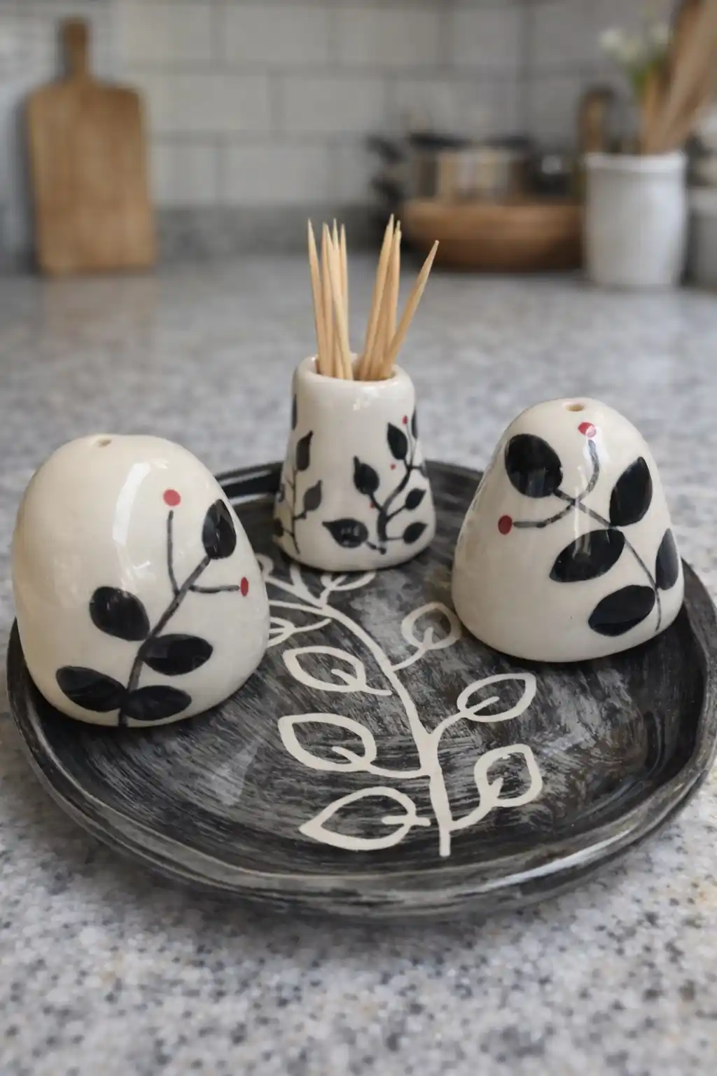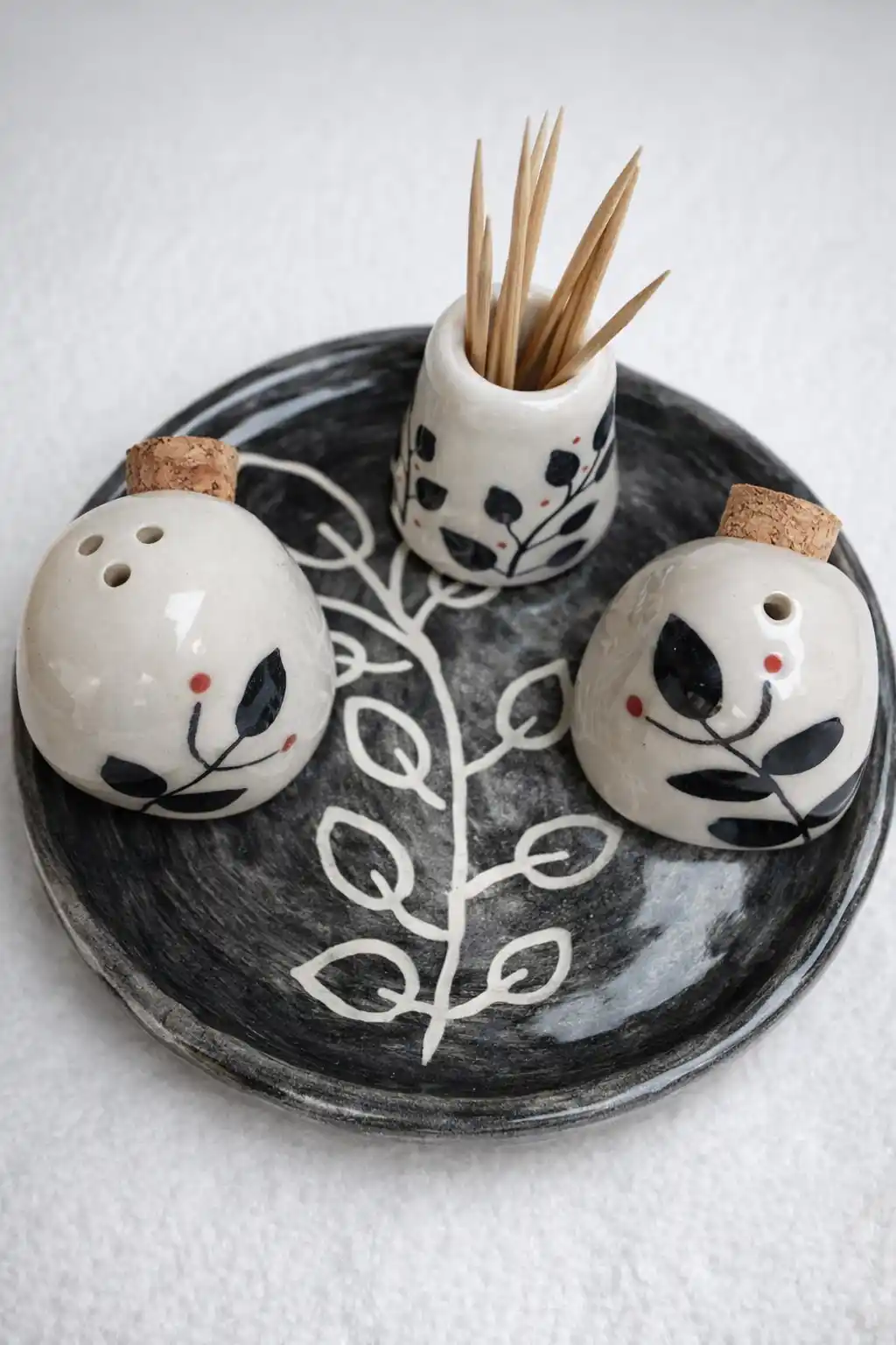 Kit condimentero con palillero incluido. Plato + 3 piezas de cerámica artesanal hecho a mano, único en diseño y lleno de detalles que transmiten calidez y autenticidad.