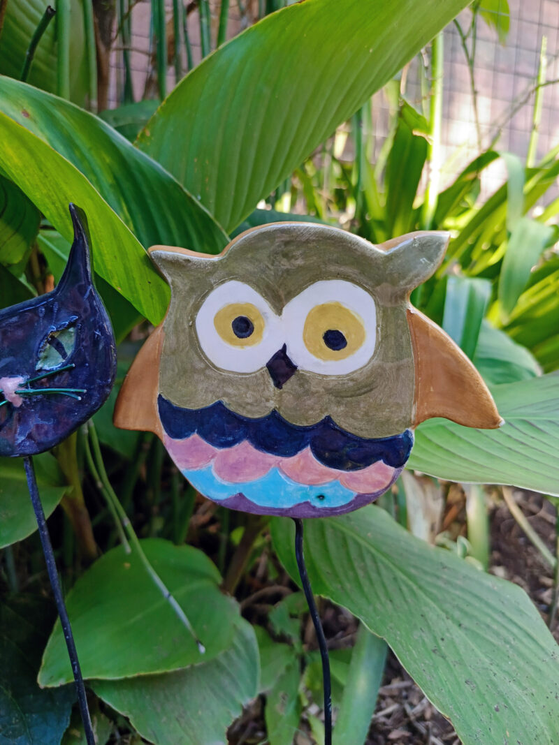 Modelados y esmaltados manualmente, con formas divertidas y colores vibrantes que aportan personalidad al jardín. Gatos, pájaros, búhos y figuras originales que se integran fácilmente entre plantas y macetas.