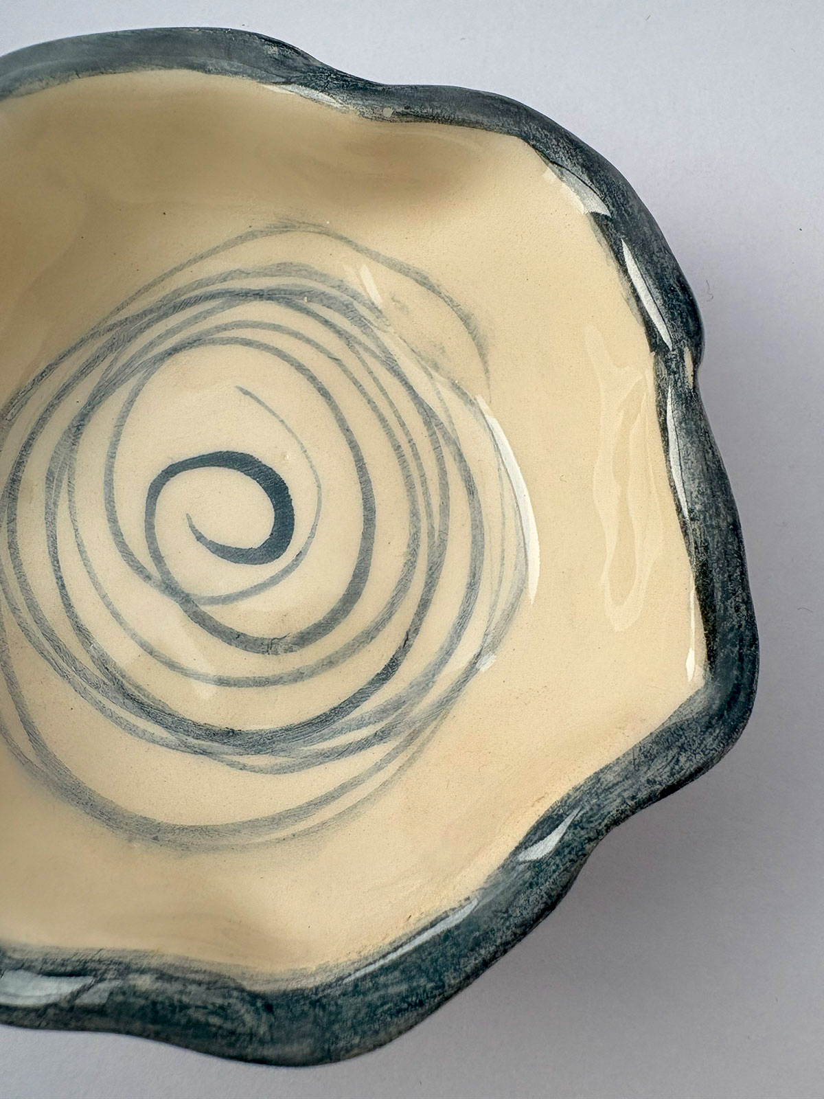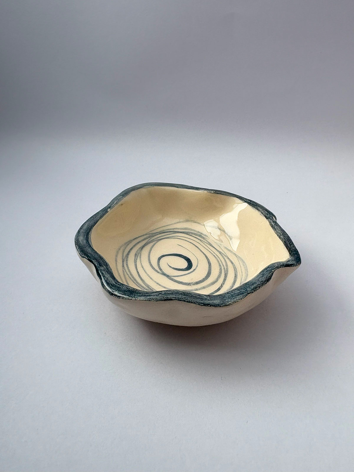 Platito espiral azul de cerámica artesanal hecho a mano, único en diseño y lleno de detalles que transmiten calidez y autenticidad.