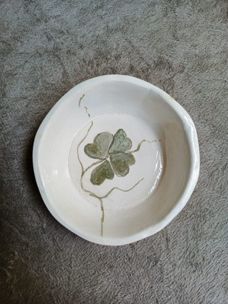 Platito trebol de cerámica artesanal hecho a mano, único en diseño y lleno de detalles que transmiten calidez y autenticidad.