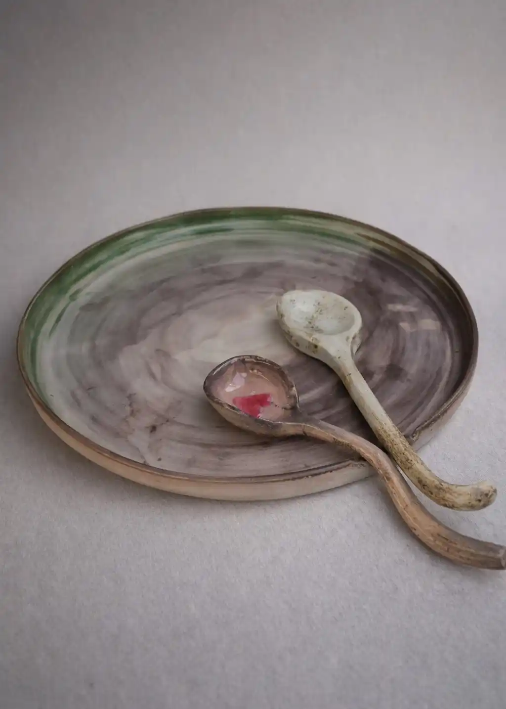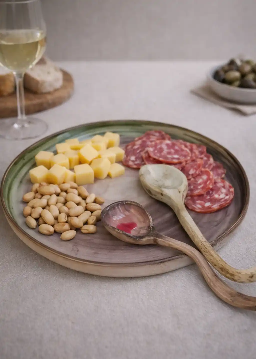Plato para picada con dos utensillos de cerámica artesanal hecho a mano, único en diseño y lleno de detalles que transmiten calidez y autenticidad.